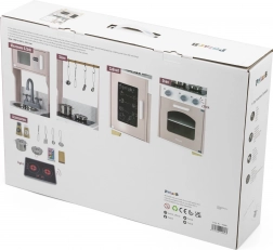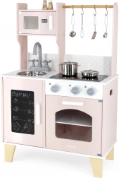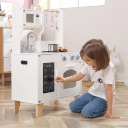 Dotazione ricca di accessori: pentola con coperchio, padella, cucchiaio, spatola forata, spatola, set di “verdure” e saliera con pepiera. Dettagli funzionali come 3 manopole girevoli, sportelli apribili di forno e mobiletto e ganci per gli utensili aggiungono realismo al gioco e sviluppano motricità fine, creatività e abilità sociali.