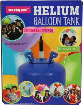 Pratica bombola usa e getta di elio per gonfiare fino a 20 palloncini in lattice di diametro 9" (22,9 cm). Adatta anche per palloncini in foil da 18" (circa 16 pz). Facile da usare, senza attrezzi, ideale per feste, matrimoni e compleanni. Volume di elio 0,14 m³. I palloncini non sono inclusi nella confezione.