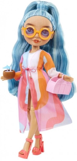 Il set alla moda di abiti e accessori per bambole RAINBOW HIGH porta il tema estivo Giornata in piscina. Include un colorato kimono, costume bianco, sandalini rosa con tacco, borsa alla moda, occhiali da sole arancioni con logo e una graziosa bevanda al cocco. Adatto a tutte le bambole RAINBOW HIGH da 11" e ideale per mixare gli stili.