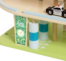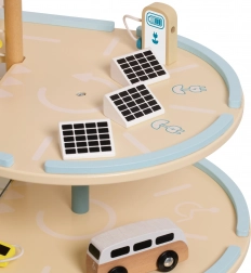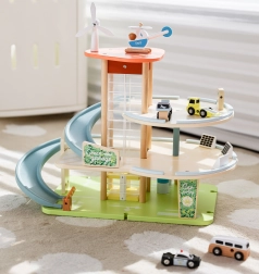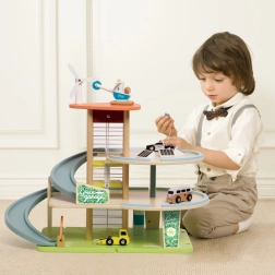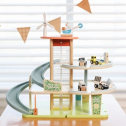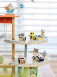 Questo edificio di parcheggio in legno a tre livelli permette, grazie all'ascensore manuale, di spostare i giocattoli tra i piani. Una speciale rampa a zigzag consente una rapida discesa delle auto. Inoltre, il dispositivo è dotato di una stazione di ricarica elettrica. Il set include tre macchinine e un elicottero, offrendo ore di divertimento e sviluppando l'immaginazione dei bambini.