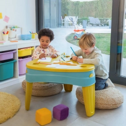 Il versatile tavolo per bambini FEER 4in1 è ideale per il giardino e l’angolo giochi in casa. Le due vaschette separate consentono di riempire con acqua e sabbia, mentre il mulinello centrale trasforma ogni versata d’acqua o travaso di sabbia in uno spettacolo dinamico. Con il coperchio inserito, il tavolo d’acqua diventa una superficie stabile per disegnare o un comodo tavolino da picnic.