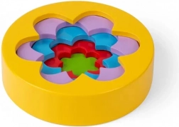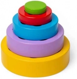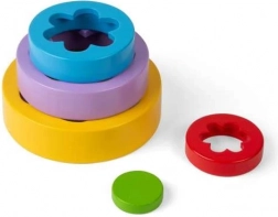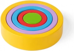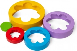 Cinque pezzi di diverse dimensioni permettono di costruire una torre o creare colorati motivi floreali. I bambini apprendono naturalmente i colori e la distinzione delle dimensioni.