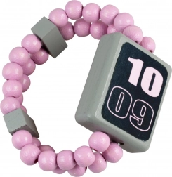 Perline di legno rosa su elastico, facili da indossare e stabili sul polso dei bambini.