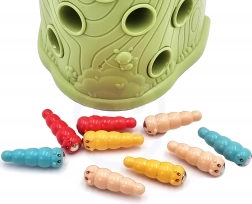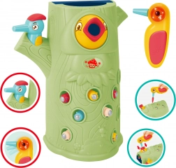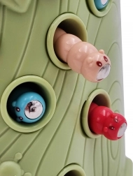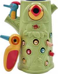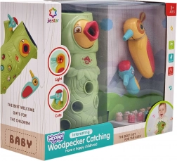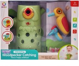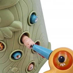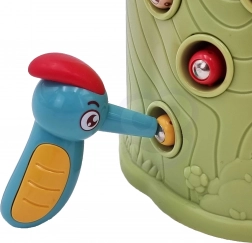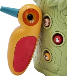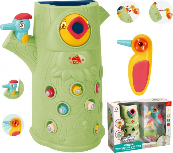 Il gioco di abilità Acchiappa il coleottero del marchio Woopie è un’ottima occasione per trascorrere del tempo con il tuo bambino. Regole semplici e un funzionamento intuitivo permettono di giocare praticamente a chiunque. L’obiettivo è catturare i coleotteri con il picchio dotato di magnete, che estrae gli insetti dai fori dell’albero, per poi inserirli nel becco dell’uccello. Nella confezione trovi, oltre ai due picchi per nutrire il piccolo e al tronco con fischietto, anche 9 coleotteri. Il picchio più grande ha inoltre ulteriori funzioni: si illumina, muove il becco ed emette suoni e melodie. Basta premere l’asta e l’occhio del picchio si accende e parte una allegra melodia ondeggiante; l’uccello può anche abbassare il becco e il suo occhio si illumina mentre cinguetta. Il gioco può essere usato contemporaneamente da due bambini. Grazie al gioco i piccoli imparano divertendosi – aiuta a sviluppare, ad esempio, le abilità motorie (movimento) e visive. Il gioco rappresenta una sfida, richiede concentrazione e manualità, coinvolgendo i bambini.