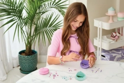 Scopri il dolce mondo della creatività con il set Macaron box per la creazione di braccialetti. Ogni macaron colorato contiene perline, ciondoli e cordini: basta infilare e creare braccialetti originali a tema dessert. Grazie alla confezione intelligente puoi misurare e tagliare facilmente la lunghezza necessaria del cordino direttamente attorno al macaron.