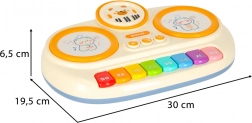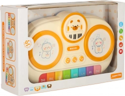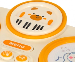- La tecnologia touch del pianoforte utilizza morbide rotelle in materiale con motivi di orsetti, che si illuminano e permettono ai bambini di creare ritmi con le mani.