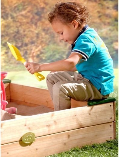 Il sandbox in legno AXI è un complemento ideale per ogni parco giochi da giardino. Include uno spazio di stivaggio per giocattoli e un telone per protezione dalle intemperie.