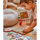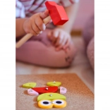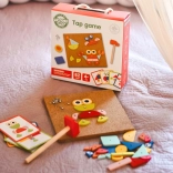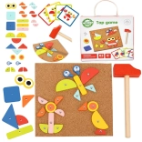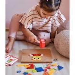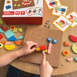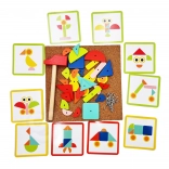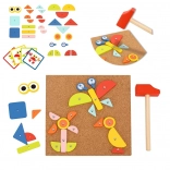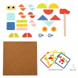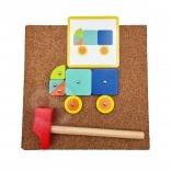Il giocattolo a martello Woopie Green è un ottimo modo per stimolare la creatività e il pensiero logico dei bambini. Il set è composto da 30 blocchi di legno, 10 carte a doppia faccia con 20 modelli suddivisi in tre livelli di difficoltà, 40 puntine, una tavola e un martello. I bambini cercano di riprodurre fedelmente l'immagine dalla carta usando blocchi di forme e colori diversi, oppure possono creare i propri disegni seguendo la propria fantasia e creatività.
