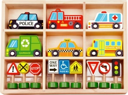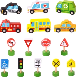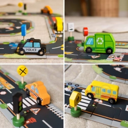- Contenuto del set: ambulanza, autopompa dei vigili del fuoco, taxi, scuolabus, auto della polizia, camion della spazzatura, semaforo e 8 segnali stradali.