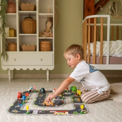 Costruire scenari, spostare le macchinine e lavorare con i segnali sviluppa la motricità fine, la creatività e le abilità sociali nel gioco condiviso.