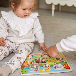 Questi puzzle in legno con pomelli sono un ottimo aiuto per i primi apprendimenti e il gioco in autonomia. Ogni pezzo si incastra perfettamente nella sede fresata sulla tavola, così il bambino allena facilmente logica, pazienza e il corretto abbinamento delle forme. Le illustrazioni vivaci della fattoria invitano a scoprire e divertirsi ogni giorno.