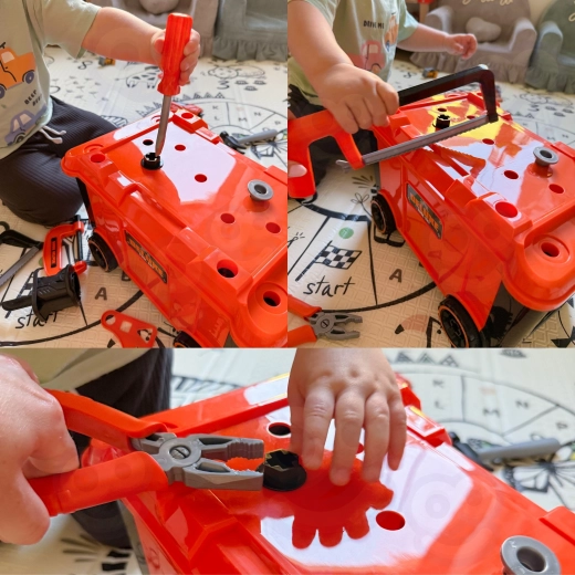 Inserti intercambiabili (punta trapano, bit a taglio e a croce) e due testine (trapano/avvitatore e seghetto alternativo) per un gioco di montaggio ancora più divertente. Alimentazione 2× AA (non incluse).