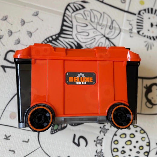 La valigia officina mobile Woopie offre ai bambini tutto ciò che serve per un gioco da piccoli riparatori sicuro e fantasioso. La struttura in plastica robusta nei colori arancione–nero–grigio resiste all’uso quotidiano e, grazie alle ruote e al manico telescopico, i piccoli maker possono portare il loro set officina portatile ovunque.