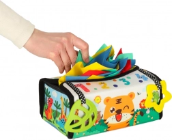 Gamma di stimoli sensoriali: Include 8 fazzoletti colorati e 3 tessuti più spessi con motivi unici. Aprendo il tappetino, il bambino scopre uno specchio e due mordicchiatori in gomma. Ogni elemento stimola vista e tatto, alcuni tessuti contengono pellicole sottilmente fruscianti per sviluppare l'udito.