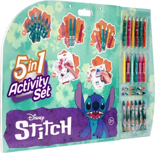 Il set da pittura 5 in 1 con motivo Stitch offre tutto per un piccolo artista in un unico set. Con questo ricco kit, ogni bambino può immergersi nel mondo del disegno e della pittura con il personaggio amato Stitch. Contiene 6 pennarelli, 6 pastelli, 6 cere, 58 adesivi, 15 stencil e 35 disegni da colorare per la massima creatività.