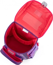 Lo zaino è composto da un unico scomparto spazioso che può contenere facilmente tutto il necessario per la scuola. Il fondo dello zaino è in materiale rigido per proteggere il contenuto. La chiusura è realizzata con fibbia metallica di sicurezza con catarifrangente. La tasca anteriore è destinata per la merenda e non mancano gli elementi riflettenti che assicurano visibilità.