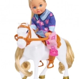 Cavallino bianco con lunga criniera, sella, briglia e staffe, così Evi può partire subito per una passeggiata. Perfetto per scenette dal maneggio.