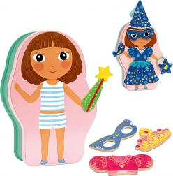 Magico puzzle magnetico per piccole creatrici in una pratica scatola a forma di fata. I bambini si divertiranno con infinite combinazioni di abiti e accessori grazie a 24 pezzi magnetici, che si uniscono facilmente e saldamente. La scatola a doppia faccia offre due personaggi diversi, così il divertimento non finisce mai.