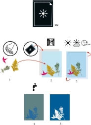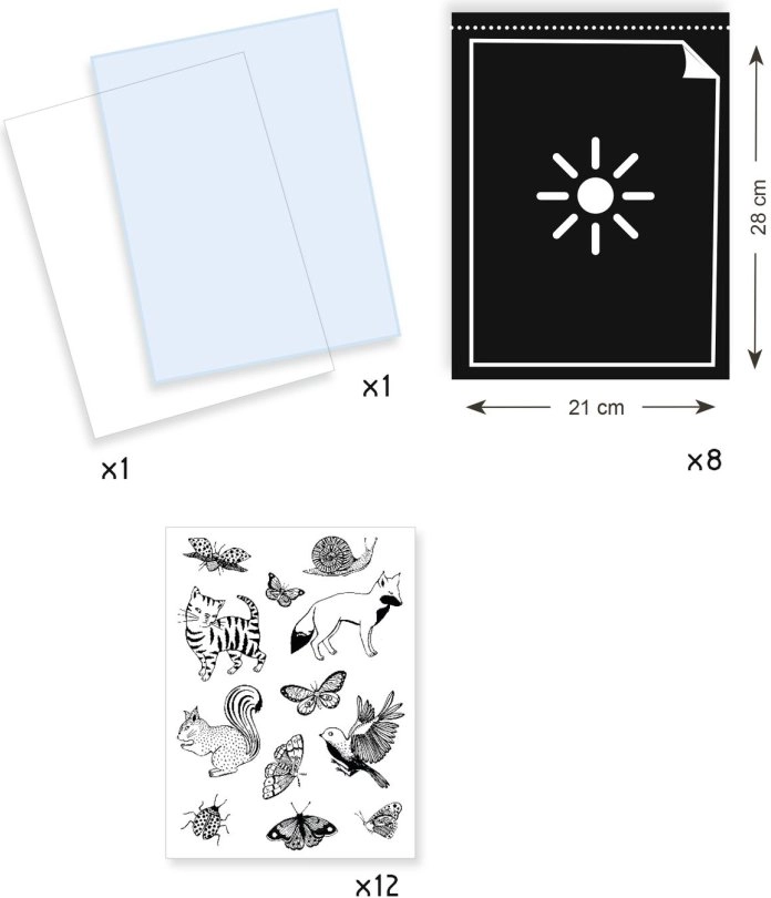 8 fogli di carta fotosensibile, 12 motivi stampati su acetato, 1 foglio di plexiglass