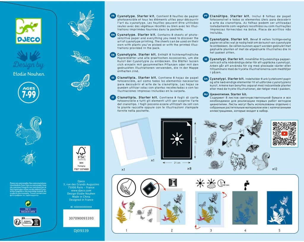 Scoprite la magia della stampa solare con il set creativo Djeco. Basta disporre i motivi sulla carta fotosensibile, esporli al sole e poi sciacquare con acqua: nasceranno poetiche immagini blu con splendide ombre di motivi naturali. Ideale per bambini creativi e adulti che desiderano una tecnica semplice ed efficace senza disordine.