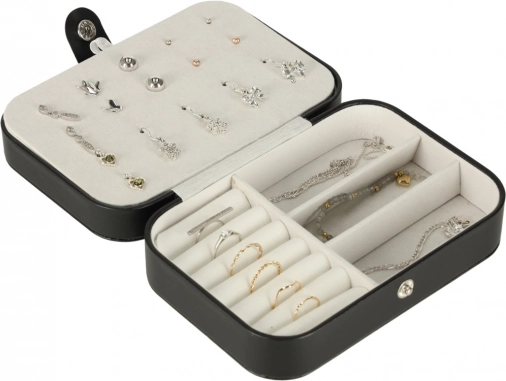 All’interno trovi due sezioni principali separate da un divisorio, rulli per 12 anelli, pannello per 10 paia di orecchini (a bottone), pratici scomparti divisi per pendenti, perline e piccoli oggetti, nonché 5 ganci con taschina elastica per riporre le collane in modo ordinato senza grovigli. La chiusura a pressione mantiene il contenuto ben chiuso durante il trasporto.