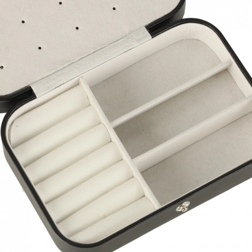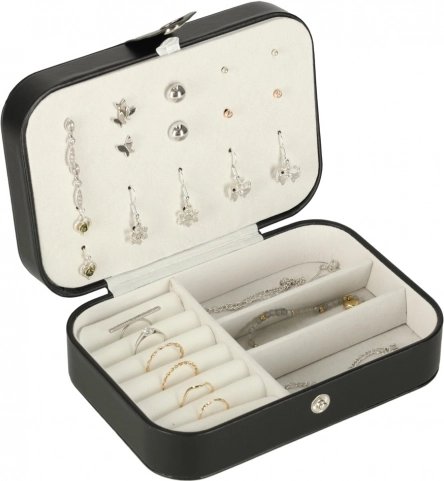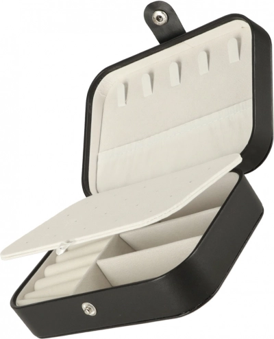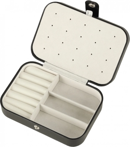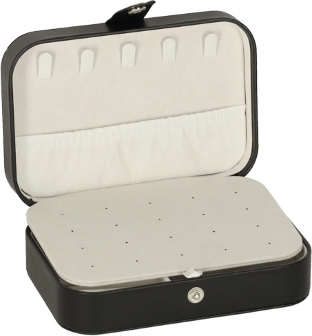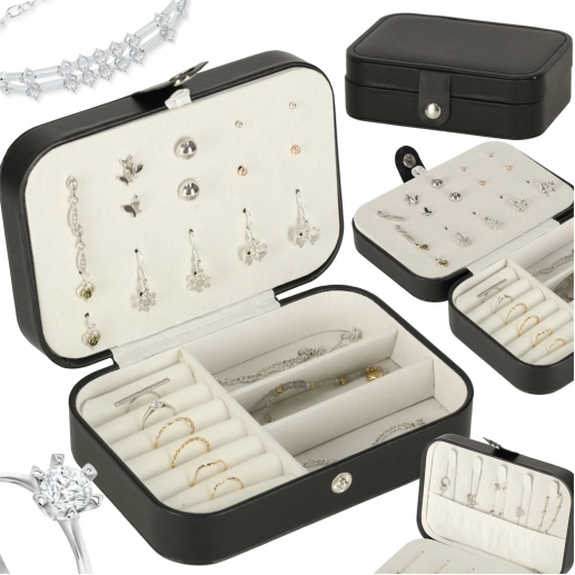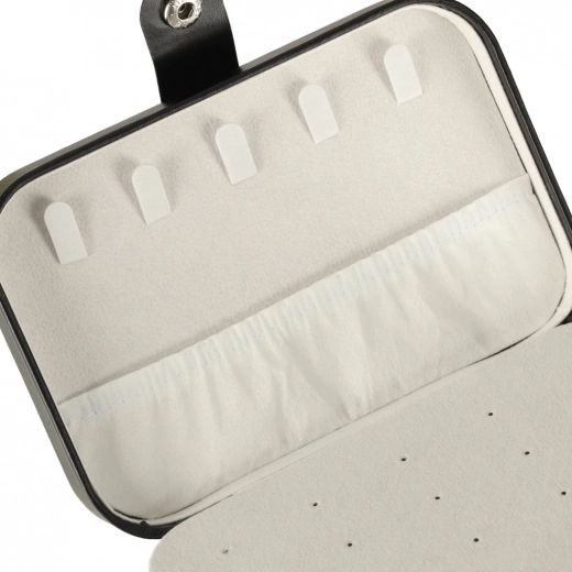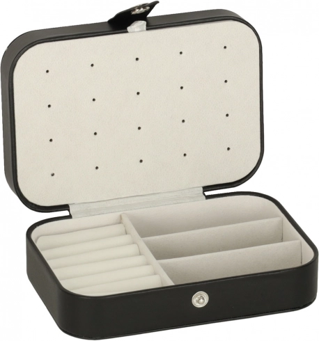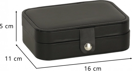 Superficie resistente in colore nero, chiusura a pressione robusta e cuciture precise. I gioielli restano al sicuro a casa e in viaggio, senza graffi o perdite.
