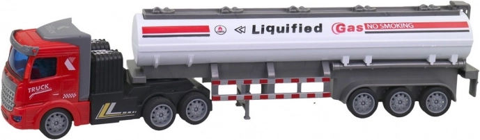 Il giocattolo imita esattamente un vero camion cisterna con dettagli come le scritte 'Liquified Gas' e 'NO SMOKING'.