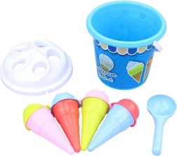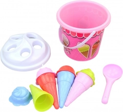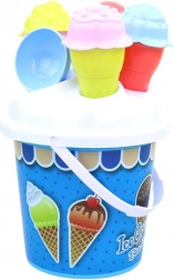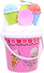 Il set include un secchiello con manico per un facile trasporto in spiaggia o nel parco giochi. Il secchiello è decorato con suggestive grafiche di gelato.