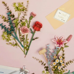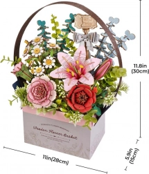 Il pacchetto include tutti i pezzi necessari: cestino di legno, giglio rosa, rosa rossa, camomilla, garofano rosa, eucalipto e piante decorative. Questo set è fornito smontato con istruzioni dettagliate per l'assemblaggio.