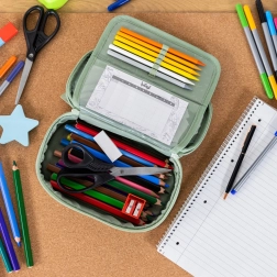 L'astuccio scolastico Etue Mentolo è spazioso con doppia aletta ripiegabile e tasca interna. Il materiale è resistente, riciclato e le cerniere YKK offrono un'eccellente resistenza. La sacca per scarpe è realizzata in materiale robusto e lavabile, con chiusura tramite cordoncini robusti per un comodo trasporto sulla schiena.