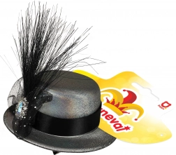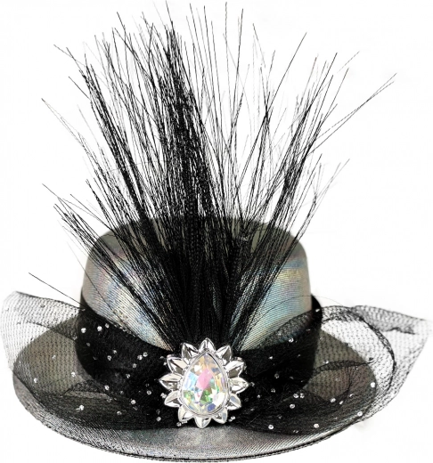 Elegante mini cappello d'argento con nastro nero, piume e tulle impreziosito da un gioiello, dona un tocco di classe alla tua acconciatura. Si attacca facilmente grazie a due clip per una vestibilità sicura.