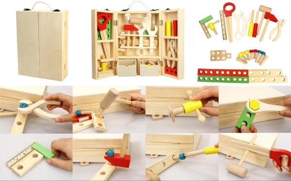 Attrezzi in legno per bambini in una pratica valigetta! Un set fantastico per piccoli artigiani che sviluppa la motricità e la creatività.