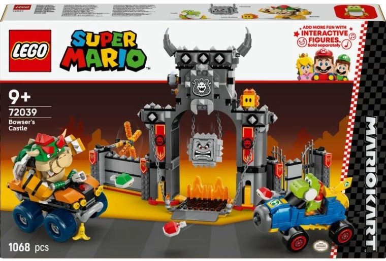 Entra nel mondo di gare e duelli nel leggendario castello di Bowser. Questo grande set da 1068 pezzi offre ricchi elementi di gioco: muri del castello assemblabili, Fire Bar rotante, Thwomp cadente a catena e ostacoli interattivi con la lava. Inclusi quattro personaggi da collezione – Bowser, Yoshi, Thwomp e Lava Bubble – oltre a proiettili a forma di guscio e una banana per emozionanti battaglie in pista.