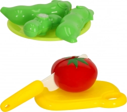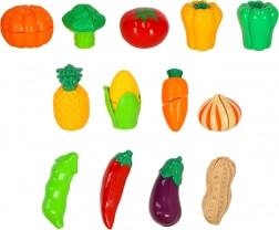 - Frutta e verdura con velcro (13 pz): piselli nel baccello, peperone verde, peperone giallo, peperoncino, cipolla, broccoli, mais, pomodoro, ananas, zucca, melanzana, fagioli, carota.