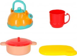 - Accessori da cucina (15 pz): teierina, pentola con coperchio, posate (coltello grande e piccolo, cucchiaino, forchetta), tazza, tagliere, piastrina/cucinina per bambini, cestino.