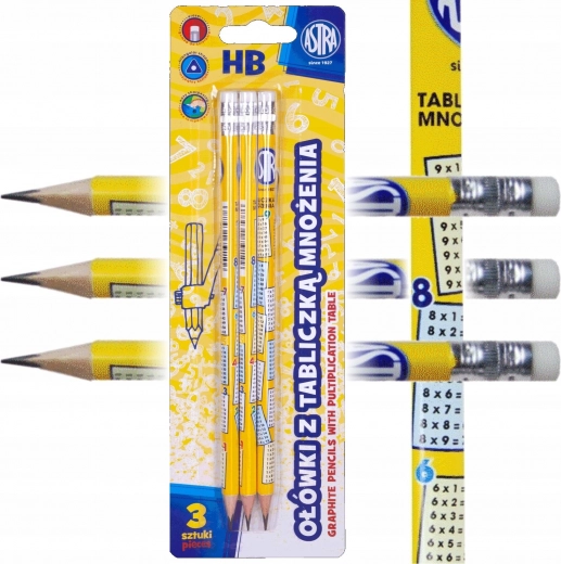 Set di tre matite ASTRA con durezza HB e pratica stampa delle tabelline che facilita lo studio e la scrittura. Offrono un corpo ergonomico triangolare per una presa confortevole, una mina da 2,2 mm di qualità e una pratica gomma all’estremità. Il legno proviene da foreste gestite responsabilmente.