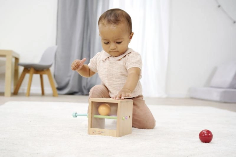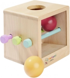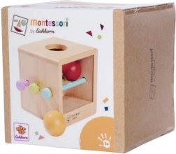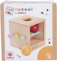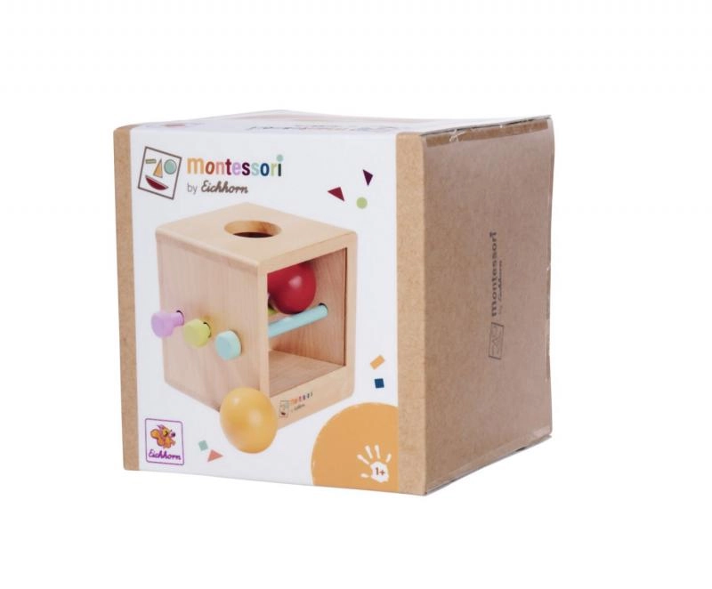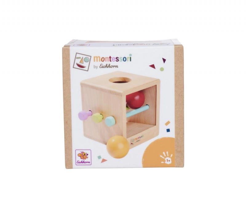 La scatola Montessori si basa sui principi della pedagogia Montessori: il bambino inserisce la pallina nel foro, ne osserva il movimento e impara concentrazione e pazienza. Le aste inserite ostacolano temporaneamente il passaggio, così i piccoli esploratori scoprono cosa succede quando vengono rimosse. Senza aste l’attività è più semplice e ideale per i bambini più piccoli.
