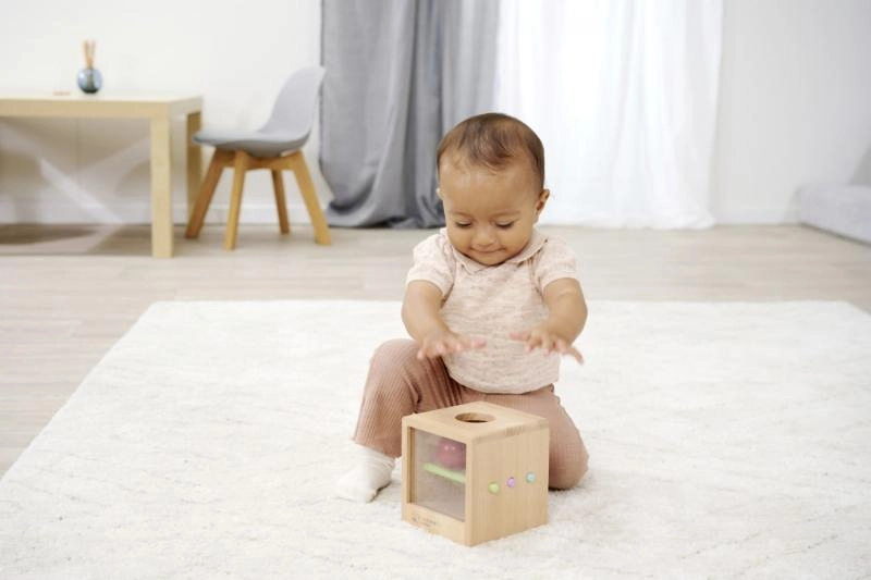 La scatola Montessori è un giocattolo educativo in legno versatile in 100% legno di faggio certificato FSC. La scatola con oblò, 3 aste e 2 palline colorate consente di impostare una difficoltà variabile – con le aste le palline si fermano all'interno, senza aste rotolano subito fuori. Supporta la motricità fine, la coordinazione occhio–mano e la comprensione di causa ed effetto. Adatto da 1 anno.