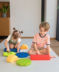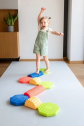 Componi liberamente il tracciato con pietre, blocchi e travetti colorati e trasforma il movimento in divertimento. Ogni elemento ha un’altezza diversa e una superficie in rilievo per un passo sicuro e un esercizio in sicurezza. Perfetto per attività ludiche in casa, asili, doposcuola e terapia sensoriale.