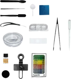 - Mini microscopio, treppiede regolabile con LED, laccetto da polso, lente d’ingrandimento, supporto per telefono, 2× boccetta per campioni, incubatore triplo con vetrini, vaschetta per preparati con vetrino, pipetta, coltellino, paletta, bacchetta, pinzetta, 12 preparati pronti, 4 vetrini vuoti, confezione colorata