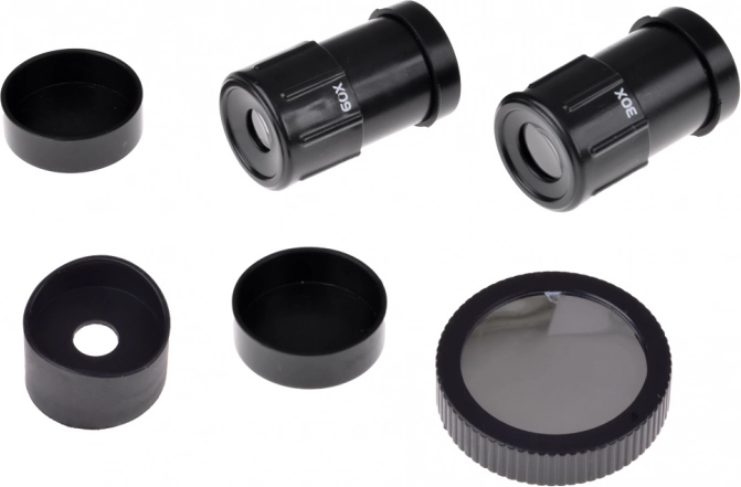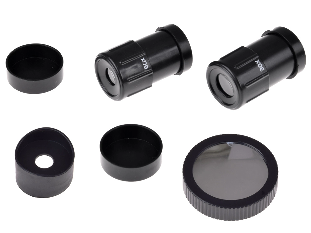 Diagonale a specchio zenitale, filtro a membrana (per osservazione sicura del Sole), cercatore, supporto per telefono, vassoio porta-accessori, copri-oculare