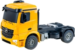 Trattore MERCEDES-BENZ con semirimorchio pianale con licenza per il trasporto di macchine edili, offre suoni realistici del motore, effetti luminosi e controllo completo su frequenza 2,4 GHz. Grazie agli pneumatici in gomma e alla regolazione della convergenza delle ruote, la guida è fluida e precisa. Il semirimorchio dispone di una rampa sollevabile e supporti regolabili e può essere collegato/scollegato elettronicamente tramite il telecomando.
