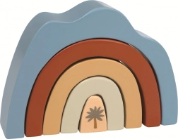 Il labirinto con perline e elefante allena mano–occhio e presa; gli archi dell’arcobaleno aiutano ad ordinare per dimensione e a costruire forme creative.