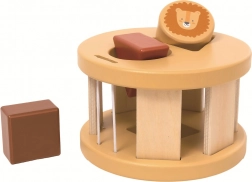 Tamburo sagomatore resistente con coperchio rotante e motivo del leone: aiuta i bambini a riconoscere e abbinare le forme, favorendo coordinazione e precisione della presa.