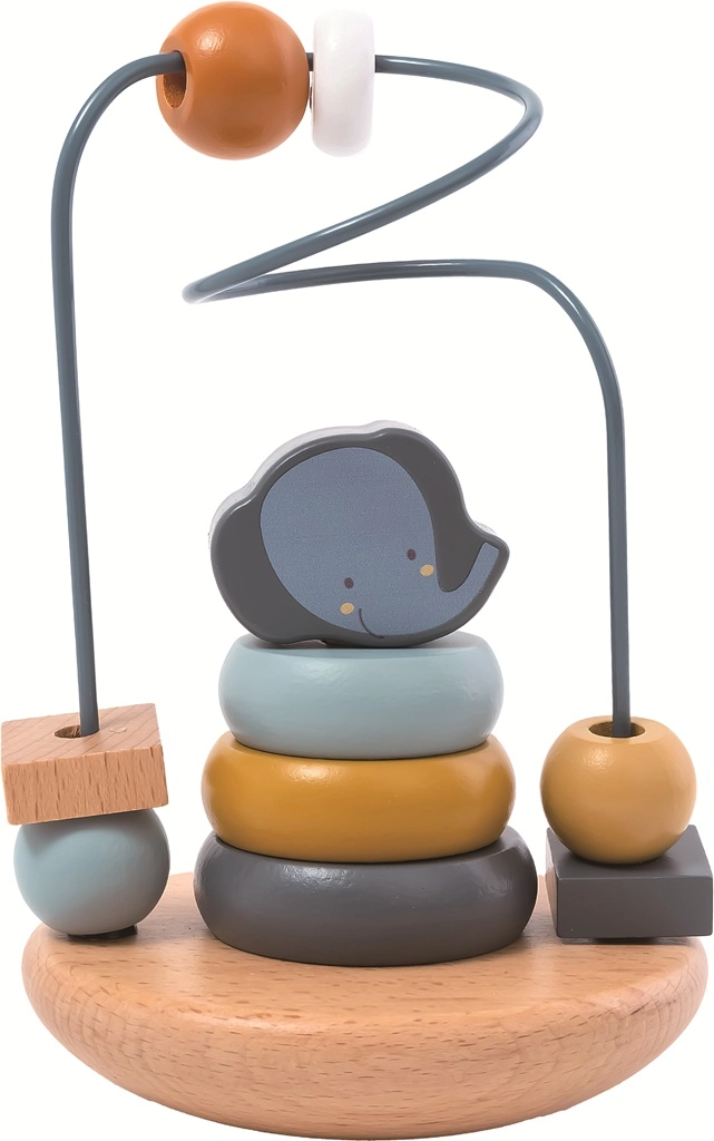 • 4 giochi in 1 set: activity board, incastri di forme (cilindro), arcobaleno impilabile, labirinto motorico con elefante.