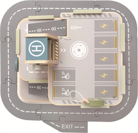 Nella confezione trovate tutto il necessario per giocare subito: quattro macchinine, un elicottero, tre segnali stradali, un autolavaggio e due colonnine di rifornimento, di cui una funge da caricatore per auto elettriche. La lavorazione sicura in legno e la struttura resistente garantiscono lunga durata anche con un uso quotidiano.