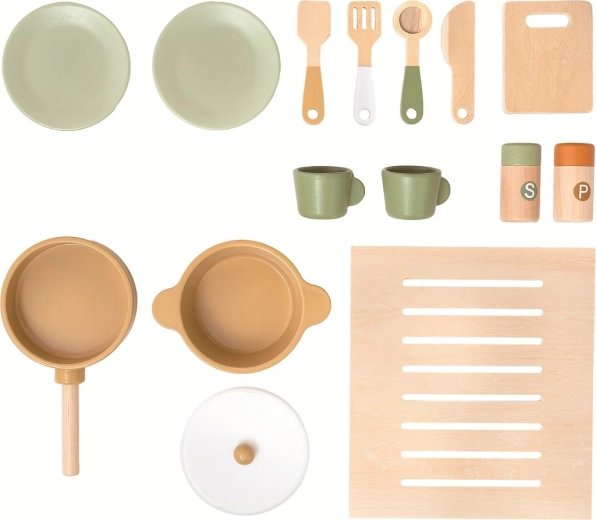 Incluso un ricco set di accessori: piatti, tazzine, padella, pentola con coperchio, sale e pepe, tagliere, utensili da cucina e griglia per il forno. La struttura in legno robusto e le vernici atossiche garantiscono sicurezza e lunga durata.