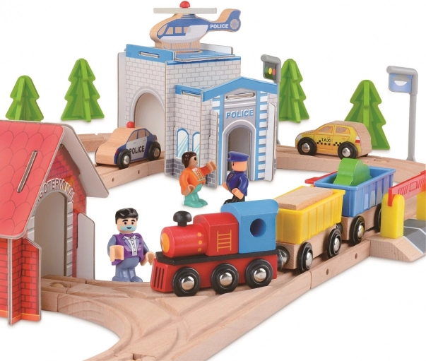 Questa pista ferroviaria, curata nei minimi dettagli, offre un mondo completo su rotaie: locomotiva con vagoni, auto, personaggi, stazione di polizia, eliporto, alberi e segnaletica stradale. I bambini possono caricare la merce, attraversare il ponte rialzato, fermarsi alla stazione e superare in sicurezza il passaggio a livello con sbarre. Ogni corsa si trasforma in una nuova storia e sviluppa logica, coordinazione occhio–mano e comunicazione nel gioco condiviso.