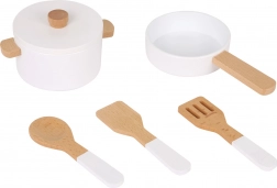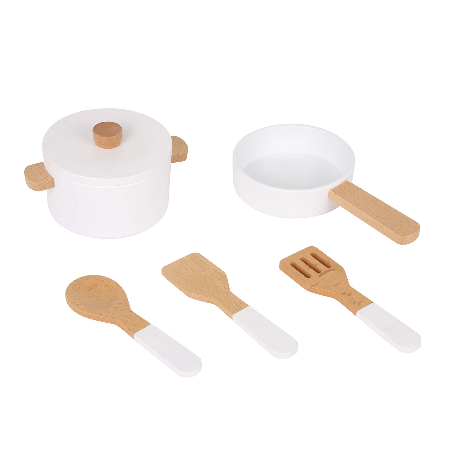Il set include tutto ciò di cui i piccoli chef hanno bisogno: lavello dorato con rubinetto, piano cottura con manopole girevoli, forno con sportello trasparente, 3 utensili da cucina in legno, asciugamano, saliera, pepiera e due pentole con coperchio. Il materiale è legno certificato FSC al 100% per un gioco sicuro e sostenibile.