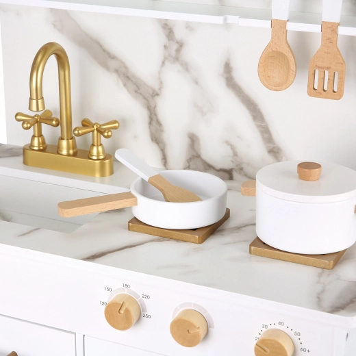 Questa moderna cucinina in legno offre ai bambini un’esperienza di cucina autentica in una soluzione sicura ed esteticamente curata. L’aspetto marmorizzato del piano di lavoro e dello sfondo dona alla cucina un design premium, perfetto sia per la cameretta che per il soggiorno. I bambini possono cucinare, mescolare, infornare e lavare i piatti, imitando gli adulti in casa.